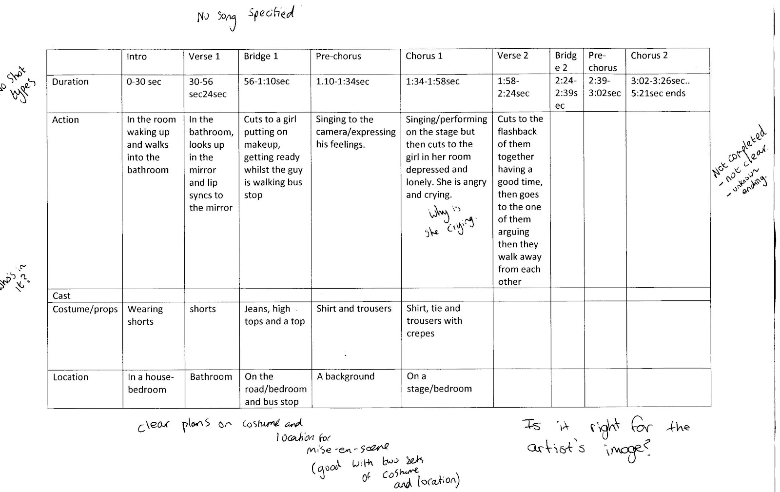 As a way of planning and deciding what music video to choose for our coursework task, we both went away and conducted research into potential music videos taking into consideration in particular the genre of the music videos. We then met up and pitched to each other the ideas we had and discussed the ideas we each came up with for our set task.